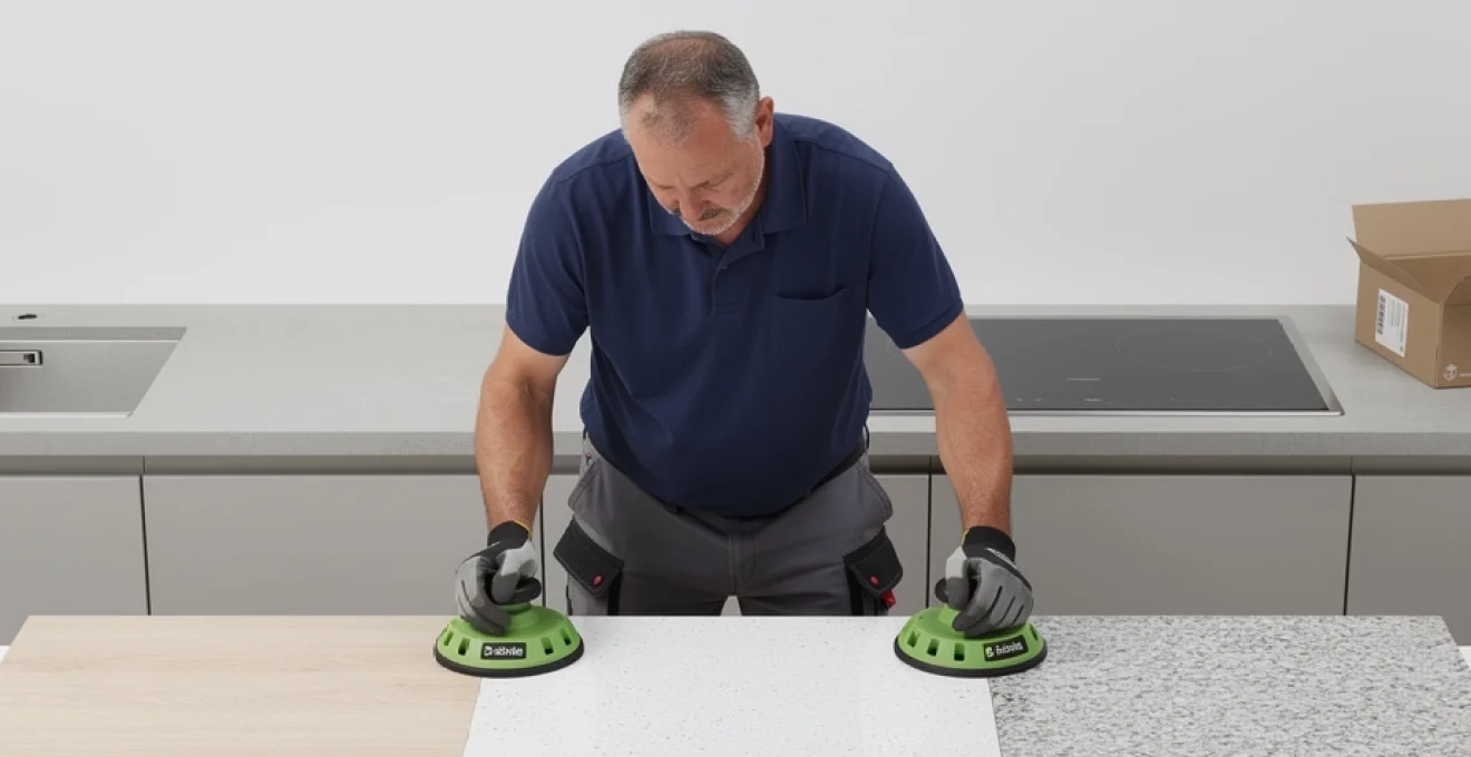 La manutention d’un plan de travail de 2 m, en particulier en quartz ou en granit, ne devrait jamais se faire à mains nues sans aides mécaniques. Des ventouses de levage professionnelles, comme celles proposées par Bohle, permettent de saisir fermement la surface plane du plan et de le déplacer en toute sécurité à deux ou trois personnes. Pour un plateau de 2 mètres dépassant les 80 kg, ces ventouses réduisent considérablement le risque de chute, de casse ou de blessure.