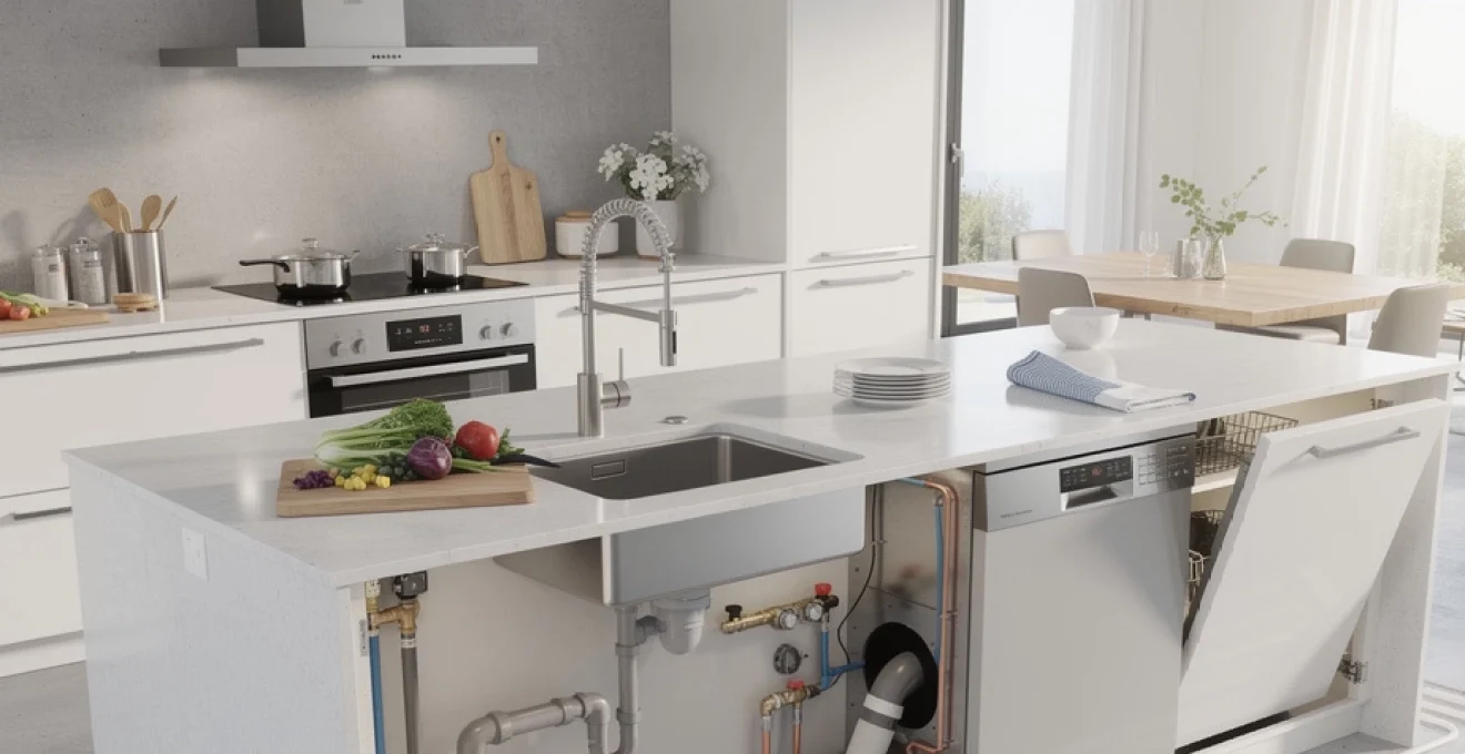 Configuration technique et contraintes de plomberie pour un évier sur îlot